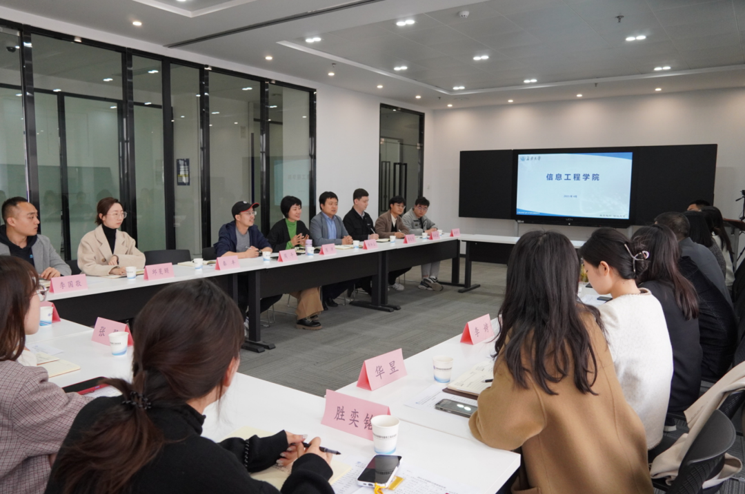 欧建东对陈沛一行来院调研表示热烈欢迎,他简要的介绍了西北大学信息学院的基本情况、并就两院学工队伍交流合作进行了深入探讨;杨帆以党建引领与科研工作深度结合、组建党员宣传团等为例,详细介绍了本院党建创新品牌和特色做法;辅导员蒋晨阳介绍了学院在毕业生就业、考研升学、职业生涯规划等方面所做出的探索、努力和成就。