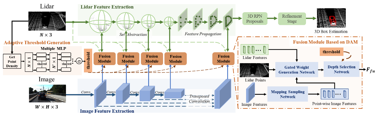 提出了一个自适应阈值生成网(ATGN),考虑以点密度为特征及其与深度的负相关关系,通过提取点云密度信息来自适应生成深度阈值,作为划分点云的小型判别器,指导融合过程有效完成;