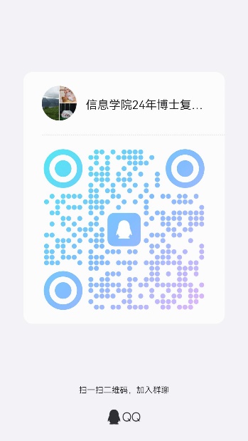 请各位考生于5月17日18:00之前加入“信息学院24年博士复试”QQ群,群号:557460298(申请形式:姓名)。