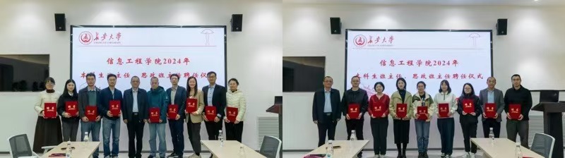 陈俊鹏颁发本科生班主任、思政班主任聘任证书并讲话。他对各位新聘班主任表示感谢,并提出三点要求:一是践行教育家精神,在学生思想政治教育上用情;二是落实“三全育人”,在学院协同育人上用心;三是发挥专业引领优势,在学生专业发展上用力,助力学生成长成才。